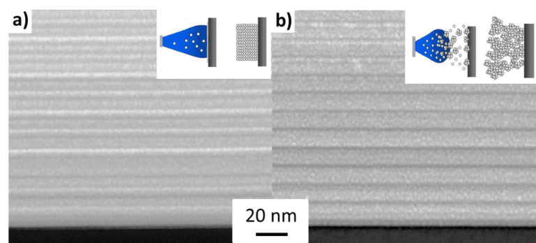 Pulsed laser deposition (PLD) offers the possibility to control the morphology of the film by simply changing the deposition pressure inside the machine. Films deposited in vacuum will have a compact structure due to the atom-by-atom growth caused by the high energies within the plasma plume. The addition of a gas reduces the plasma energy and causes a cluster-assembled growth of the film (nanogranular structure).